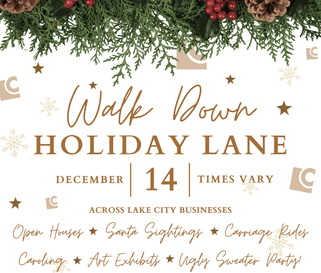 Walk Down Holiday Lane in Lake City Several downtown businesses are extending their holiday spirit to the Lake City community on Saturday, December 14th! In addition to picking up gifts