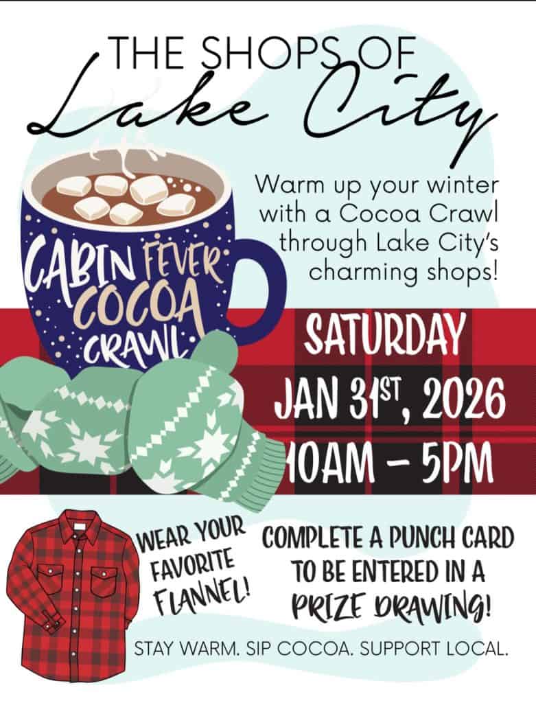 Warm up your winter with a cocoa stroll through the Shops of Lake City. Wear your favorite flannel! Complete a punch card and be entered in a prize drawing. Where: