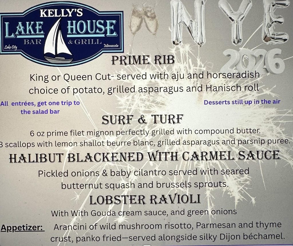 Enjoy a special menu at Kelly’s on New Years Eve at Kelly’s Lake House. Prime rib, surf and turf, halibut, lobster ravioli! Reservations are a must. Call Kelly’s today! 651-448-8840