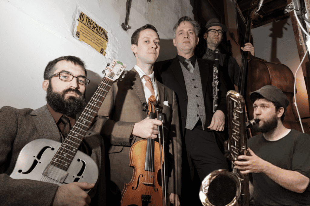 Mumblin’ Drew’s Oldfangled Orchestrators (MOO) are purveyors of novelty, squeezed through a cheesecloth filter of eccentric entertainment. A string band at its core…but with a reed section – fiddle, clarinet,