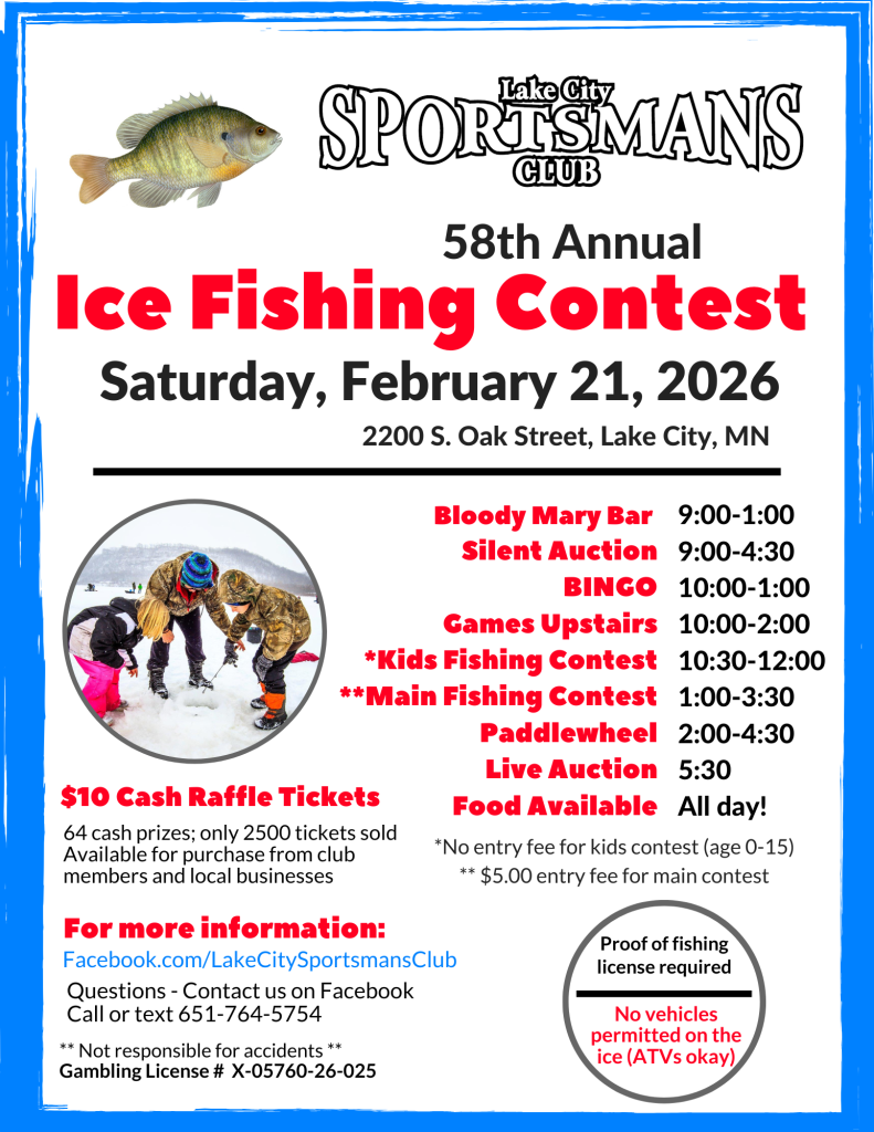 Save the date! The 58th Annual Lake City Sportsman’s Club Ice Fishing Contest will be held Saturday, February 21, 2026! Adult and Kids Fishing Contests Bingo! Prizes and Raffles Silent